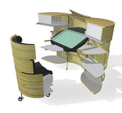 Unusual, but quite convenient conceptual solution for home and office invites the Australian Bureau of architectural Andrew Maynard Architects. Design Pod is a universal job "all-in-one", a unique office on wheels, with one - computer table, a chair and a lot of shelves and boxes for storing papers and other supplies. The most interesting thing is that all this is going to consolidate and turns in a relatively small cylinder on wheels, which can be easily moved from place to place, as well as how to use the nightstand, table, etc.